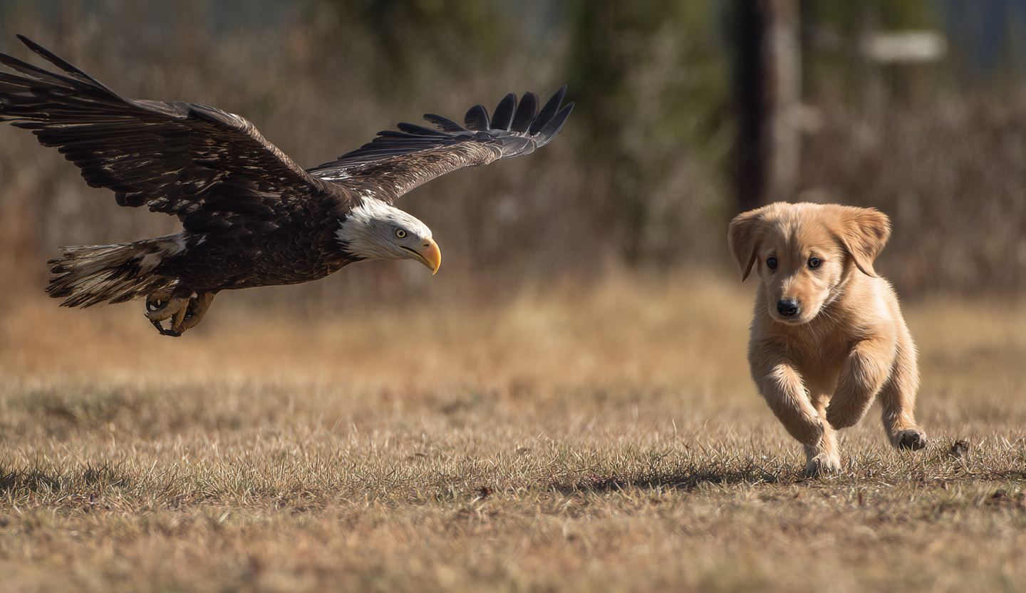 Bem acima das casas, uma águia enorme circulava o bairro, com as penas douradas a brilhar ao sol. Sem qualquer aviso, mergulhou a grande velocidade, com as garras estendidas, em direção a um quintal sossegado. Antes que alguém pudesse reagir, a águia agarrou um pequeno cachorrinho que estava na relva e voltou a subir aos céus. Durante alguns segundos, ninguém conseguiu mexer-se. Parecia uma cena de um documentário sobre a vida selvagem, mas estava a acontecer ali mesmo, por cima das suas casas!
